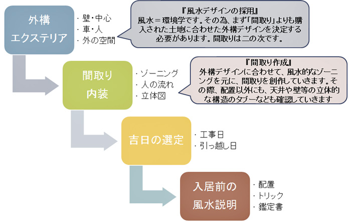 風水は人の人生の性格・人生と同じ様に個性を持っています。この個性をまず調査。その個性に合わせた建物のデザインをご提案します。土地とエネルギー(運気)に合わせて、好きなように建物のデザインが可能です。将来に向けて理論的に「ビジネス運」を50年後にする事も、今すぐに享受する事も可能です(これは、土地に左右されます)。※状況により、お断りさせて頂く場合があります。